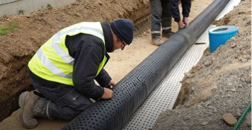 При монтаже дренажных труб создается уклон в направлении водоотвода — на каждый погонный метр трассы делается понижение на 1 сантиметр, что обеспечивает самотечное движение воды. Трубы соединяются между собой муфтами, а в местах поворотов устанавливаются смотровые колодцы.